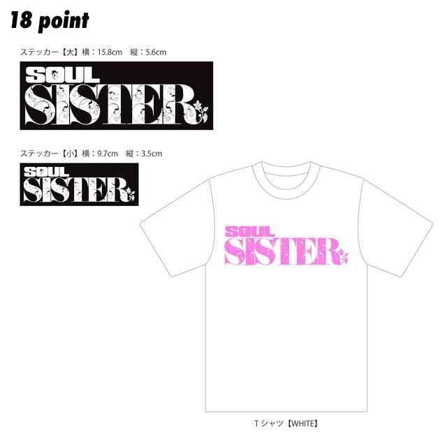 SOULSISTERのロゴTシャツ、ステッカー大と小、各1点づつのフルセットです。 こちらの商品には2025モデルオーディションの投票権(18P)が付与されます。 推しのモデルを選んでご購入してください。 •SIZE 身丈 72cm・身幅 55cm・肩幅 50cm・袖丈 22cm •MATERIAL Cotton 100%